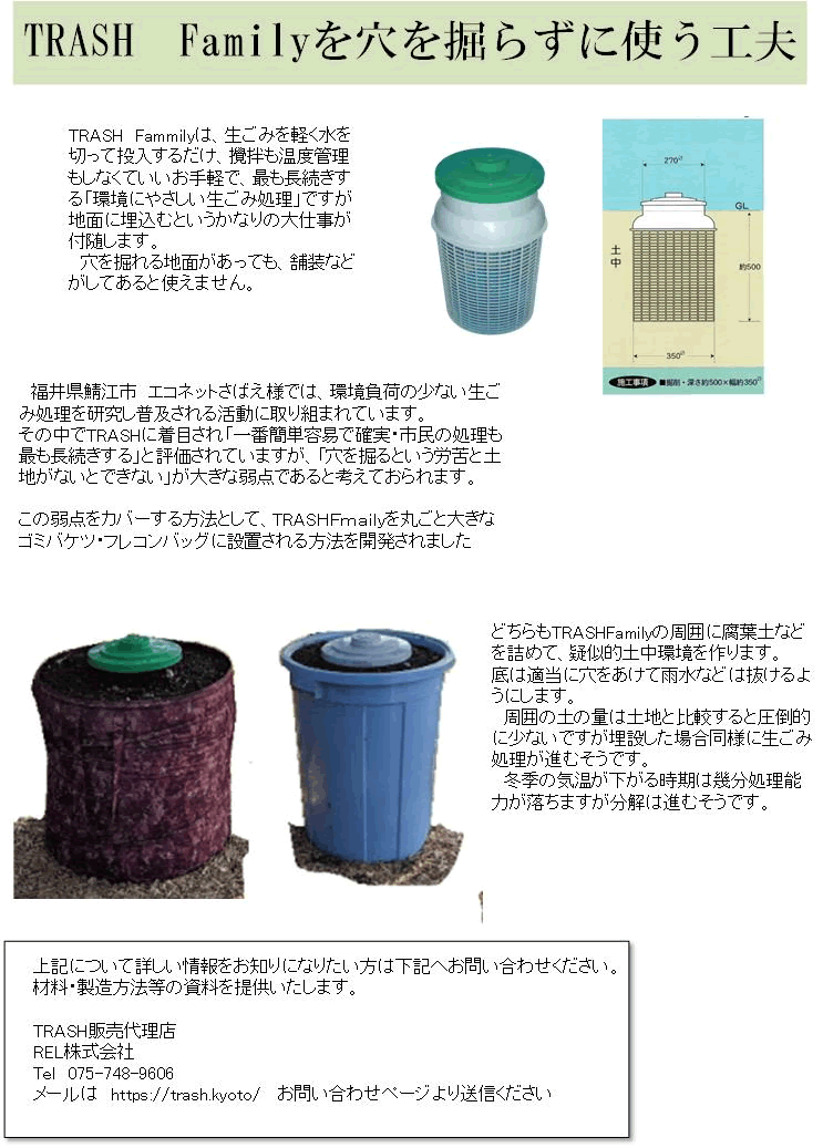 TRASH(トラッシュ)は生ごみ(有機性廃棄物)を土中で人にとって不衛生な環境にならないよう最小限の管理をしながら、その土中に太古の昔から命をつないできた微生物や小昆虫類により分解活用してもらい、窒素やリン微少金属類などだけを残すところまで分解してもらういたって原始的で、しかし、最も合理的な生ごみ処理方法です。